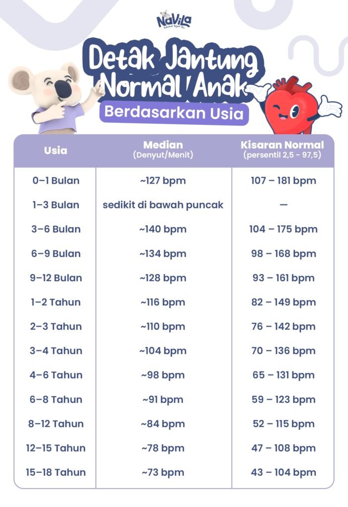 Penurunan ini menunjukkan bahwa jantung semakin efisien dalam memompa darah seiring pertumbuhan. Agar hasil pengukuran akurat, pastikan anak dalam keadaan tenang ketika diperiksa. Pengukuran setelah bermain, menangis, atau aktivitas fisik bisa menghasilkan angka lebih tinggi. Variasi kecil di luar normal nadi pada anak tidak selalu berarti ada gangguan, terutama bila anak tetap aktif dan tidak menunjukkan tanda-tanda seperti sesak napas, pusing, atau lemas.
