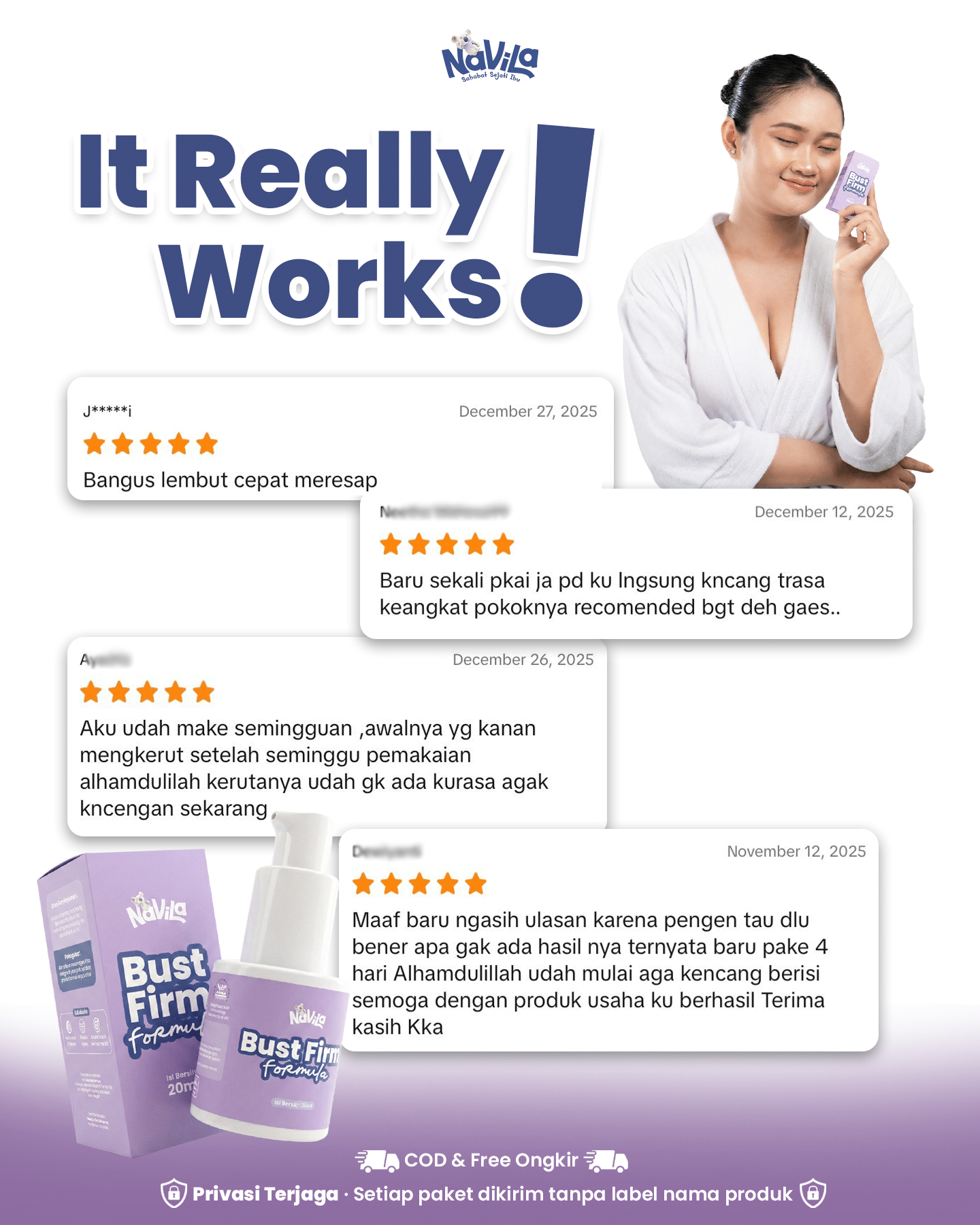 Navila Bust Firm Formula adalah serum perawatan payudara premium yang diformulasikan khusus dengan bahan-bahan terbaik, seperti Pullulan, Liftonin, Kigelia Africana Extract, Panax Ginseng Extract, dll.